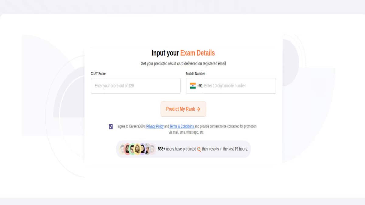 Candidates awaiting their CLAT 2026 scores, can predict their rank with the help of Careers360 rank predictor. Candidates just have to write their expected CLAT 2026 score and registered mobile number to get their expected CLAT 2026 rank.